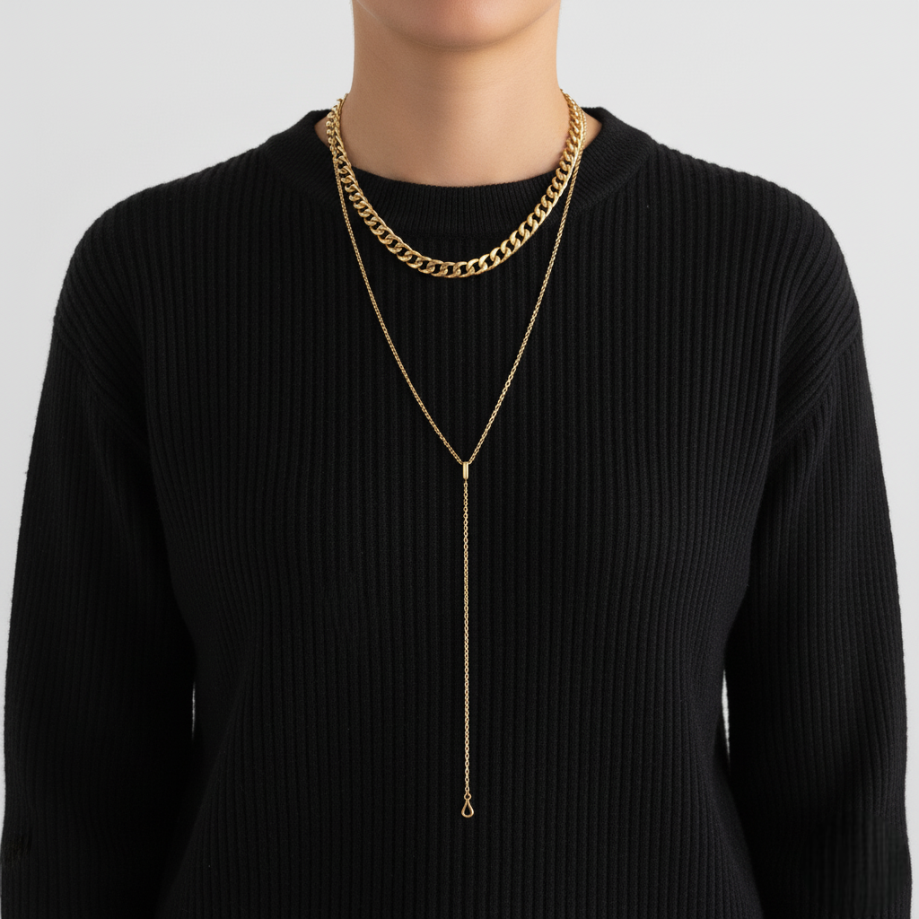 V-necks naturally create an arrow toward your waist. Echoing that triangle with a V-shaped or narrow pendant necklace completes the visual loop. Suchi’s favorite pick is a 16 in flat herringbone chain paired with an 18 in Y-neck drop for extra refinement.